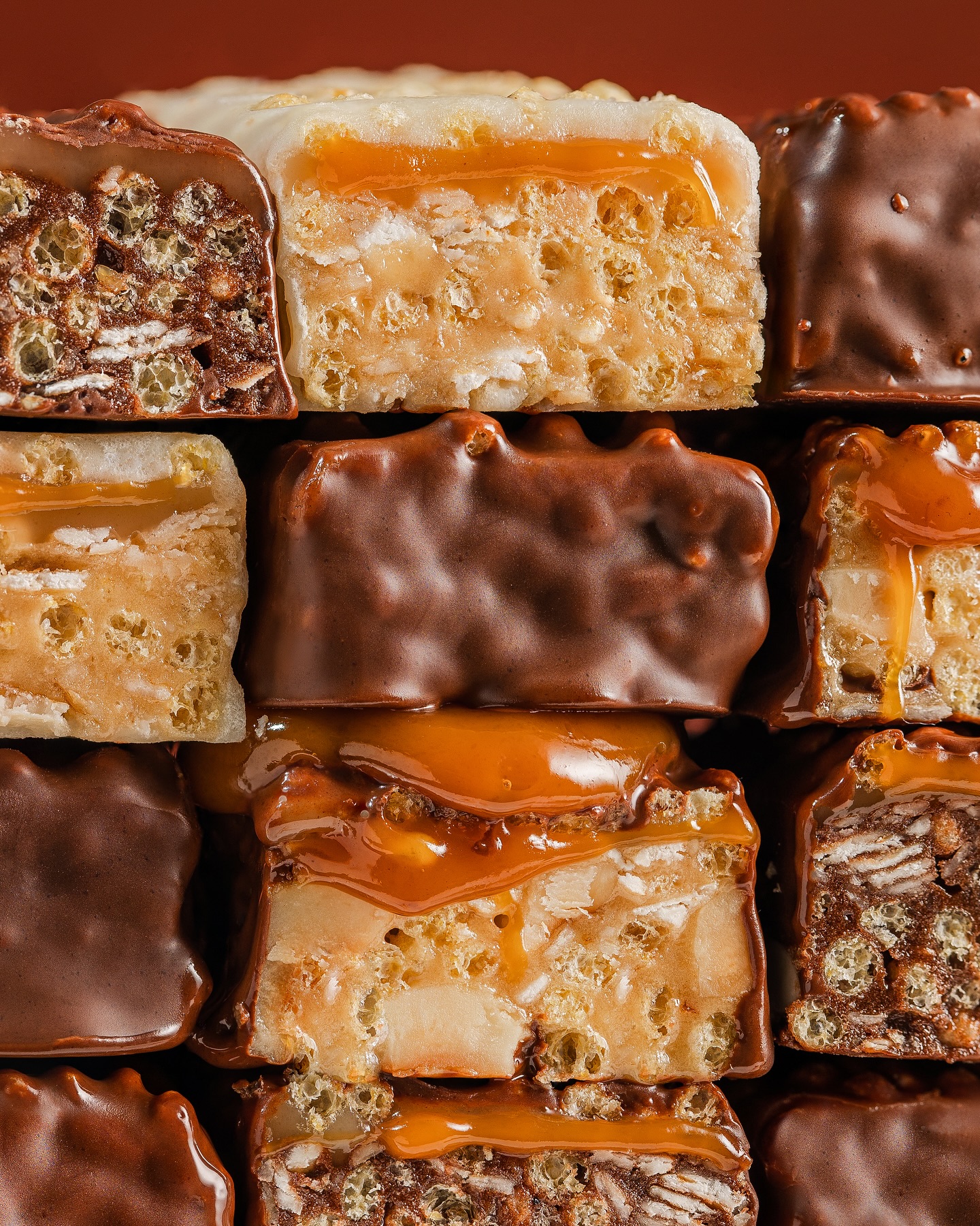 3. Avelã e Caramelo: Avelãs (40,2%), tâmaras, caramelo (19,1%) (extrato de coco, extrato concentrado de sumo de maçã, amido de milho), cobertura de chocolate (11,6%) (massa de cacau, edulcorante maltitol, manteiga de cacau, cacau em pó desengordurado, manteiga de karité, emulsificante lecitina, aroma natural de baunilha), manteiga de karité, sal rosa.