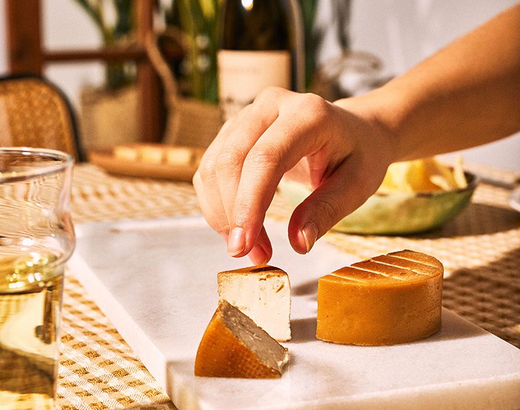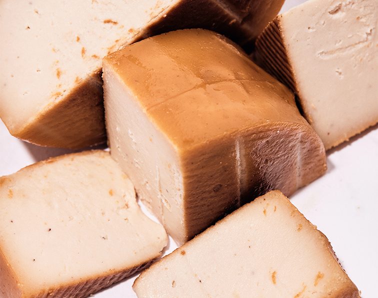 Alternativa vegetal de inspiração no queijo semicurado fumado, produzida artesanalmente a partir de caju fermentado. Durante o processo de fermentação e maturação desenvolve uma textura cremosa e um sabor equilibrado, com notas intensas de fumo natural.